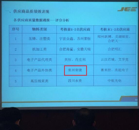 本次大會以“合作發(fā)展”為主題,聚焦“匠心精神”,會上深情回顧了“江淮巨一”2016年發(fā)展目標及完成情況,以及對供應(yīng)商質(zhì)量管理工作的績效。同時結(jié)合當前形勢,提出了2017年的質(zhì)量提升計劃,并在2016年采購基礎(chǔ)上,展示了2017年采購工作計劃。在2016年供應(yīng)商品質(zhì)績效評價中,CJE在電子產(chǎn)品外協(xié)類中被評定為前1-2名的供應(yīng)商,這是JEE對CJE電容器品質(zhì)的肯定。